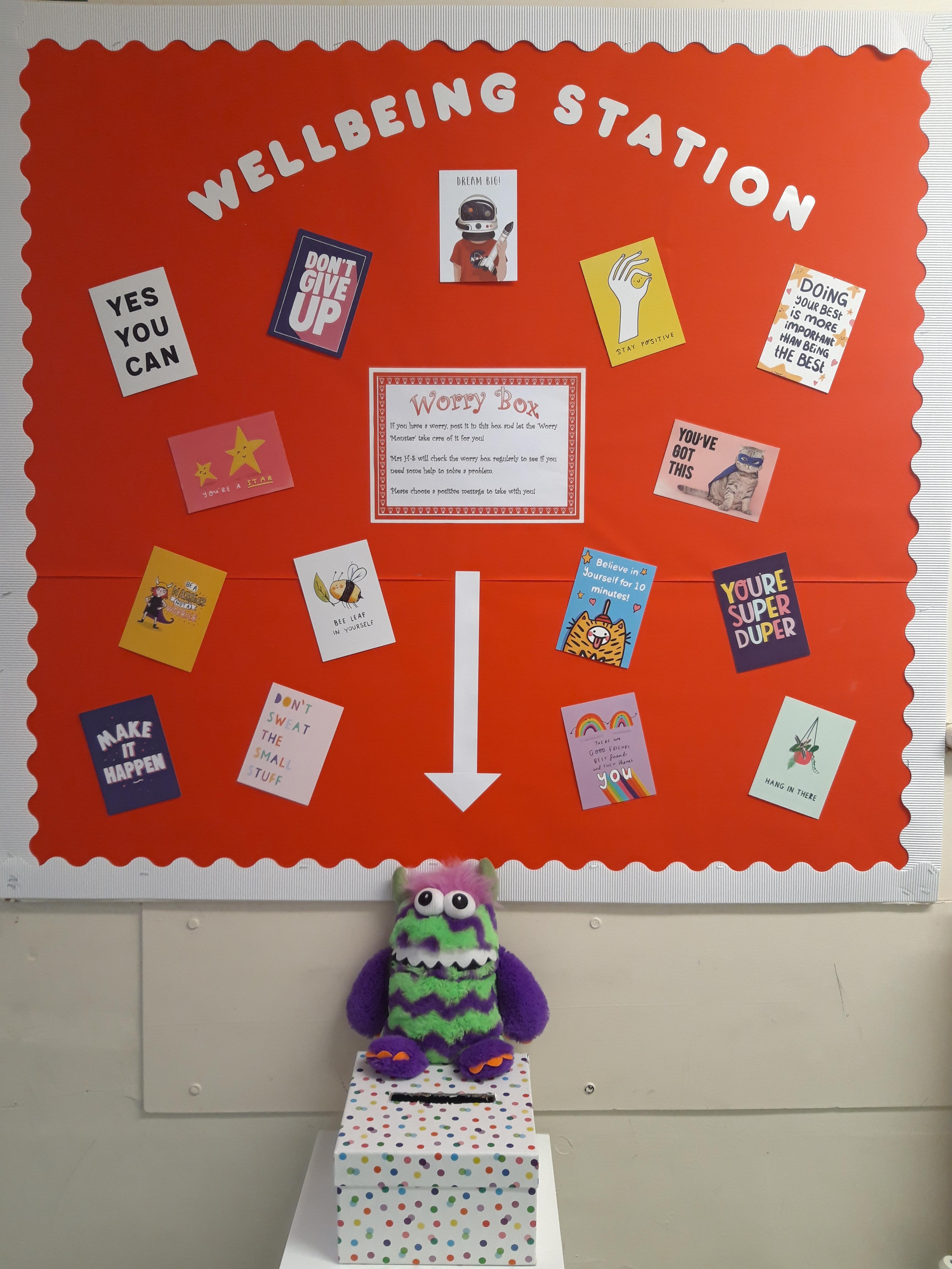 In school, we have a 'Well-being Station'. This is a place to stop, reflect and get a positive affirmation from the display board. Remember 'YOU ARE STAR'! If you have a worry, post it in the worry box. The Worry Monster will take care of it for you until a member of the staff team can talk to you!
